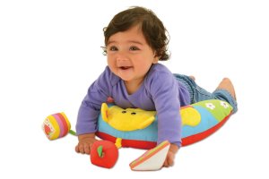 Nafukovací podložka je pokrytá látkou a je tak příjemným podkladem pod bříško dítěte pří zkoumání hraček připevněných na podložce.
