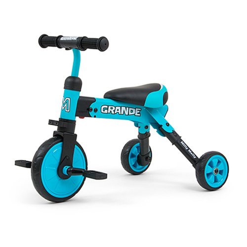 Kompaktní dětská šlapací tříkolka Milly Mally 2v1 Grande je ideálním řešením pro děti, které se právě začínají učí jezdit na kole a přitom ještě nejsou schopné udržet rovnováhu na dvou kolech. Je vyrobena z kvalitních a odolných materiálů a je ideální na procházky. Velkou výhodou této tříkolky je snadná montáž pedálů a nebo snadné složení celé tříkolky. Pěnová kola výborně absorbují rázy, poskytují dobrou přilnavost, zajistí pohodlí během jízdy a neunaví vašeho malého závodníka. Doraz nedovolí přetočení řídítek.