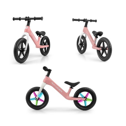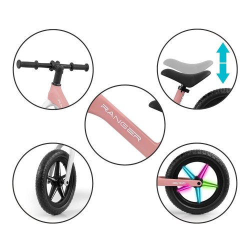 Odolná a vyrobená nejmodernější technologií z pěny EVA. 12" kola, která se nepropichují a není třeba je nafukovat, jsou bezúdržbová. Ergonomické výškově nastavitelné sedlo s měkkým polstrováním zajišťuje pohodlí dítěte a roste s ním. Kolo Ranger Flash má ložisková řídítka a ložisková kola. Protiskluzové rukojeti z měkké gumy zajišťují bezpečné uchopení a pohodlnou manipulaci.