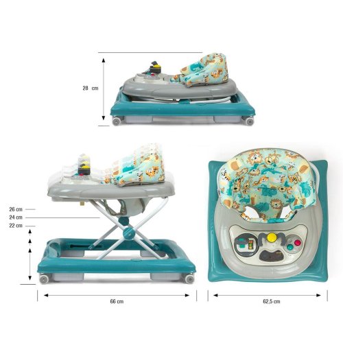 Výrobek má výukový panel, který obsahuje řadu překvapení čekajících na malé průzkumníky: světýlka, pískání, melodie, chrastítko, tlačítka a další pohyblivé prvky. Po sejmutí panelu z podnosu chodítka poslouží jako samostatná hračka, například jako společník na cesty, a deska poslouží jako hrací stolek.