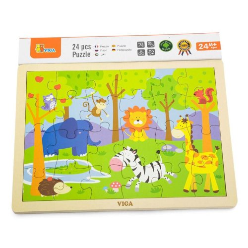 Dřevěné puzzle s obrázkem zoo. Celkem 24 dílků. Rozměry obrázku cca 27,5 x 20 cm. Rozměry balení cca 30 x 27 x 1 cm. Věk 24m+