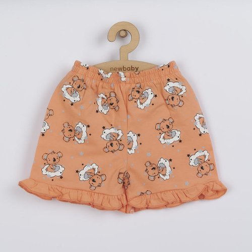 Holčičí bavlněné pyžamko české značky New Baby Dream s medvídkem. Letní pyžamko se skládá z trička s krátkým rukávem a kraťasů. Tričko s volánky zdobí na přední straně roztomilý obrázek medvídka na obláčku a hvězdiček. Zapínání na cvočky na ramínku. Kraťasy jsou celopotištěné medvídkami a na nohavičkách mají roztomilé volánky. V pase je širší lemem s gumičkou, který netlačí na bříško miminka. Vhodné i jako dětské letní oblečení. Složení: 100 % bavlna.