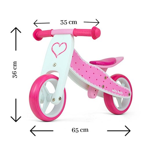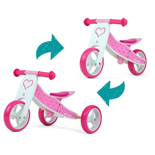 Dětské multifunkční dřevěné odrážedlo Milly Mally JAKE je ideální pro děti, které se právě začínají učí jezdit na kole a přitom nejsou schopné udržet rovnováhu na dvou kolech. Výhodou odrážedla JAKE je, že z tříkolky se snadno stane odrážedlo na dvou kolech. <BR>Charakteristika:<BR>- dvě funkce (tříkolka, odrážedlo-2 kola)<BR>- bytelná dřevěná konstrukce<BR>- 7 " pěnová kolečka <BR>- stabilní a lehká konstrukce<BR>- protiskluzové rukojeti z plastového materiálu<BR>- pohodlné, měkké nastavitelné sedadlo<BR>- regulace sedadla: 3 úrovně<BR>- kluzná ložiska<BR>- moderní design<BR>- maximální zatížení 25 kg<BR>- věkové rozmezí 18-36 měsíců<BR> je v souladu s evropskými bezpečnostními normami<BR>Rozměry:<BR>- šířka odrážedla - 3 kola: cca 42 cm<BR>- šířka odrážedla - 2 kola: cca 35 cm<BR>- šířka řídítek: cca 34 cm<BR>- výška říditek: cca 36 cm<BR>- výška sedadla od 23-27 cm - tříkolka<BR>- výška sedadla od 26-30 cm - odrážedo - 2 kola<BR>- průměr koleček cca 18 cm<BR>- celková délka cca 65 cm <BR>- výška cca 36 cm<BR>Váha<BR>- tříkolka cca: 2,13 kg<BR>- odrážedlo - 2 kola - cca 1,76 kg