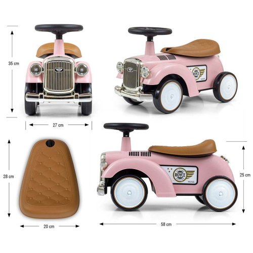 Vintige odrážedlo Royce od Milly Mally zve malé cestovatele na retro jízdu. Upoutá svými oku lahodícími barvami. Je bohatě vybaveno. Toto autíčko má volant se zvukem a tvarované sedadlo. Poskytne vašemu dítěti skvělou zábavu při řízení a rozvíjí jeho smysl pro rovnováhu a všeobecné motorické dovednosti. Autíčko má lehkou plastovou konstrukci a ergonomické tvary. Otočný volant našeho jezdce Royce umožňuje náročné manévry doma i na procházkách. Kola tohoto krásného vozidla jsou vyrobena z měkké pěny EVA. Retro autíčko může vaše dítě používat jako své první vozidlo s opravdovým volantem a klaksonem, dále jako kočárek s otevřeným úložným prostorem na hračky (malý kufr), imitací palivové nádrže na zadní části vozidla a přední částí auta - mřížkou ve stříbrné barvě. Logo ROYCE dodává tomuto vozidlu na estetice a prestiži. Závěrečnou tečkou za vozítkem Royce je jeho dárková krabička, která je zachována v charakteru retro vozidel z počátků automobilového průmyslu. Vozítko Royce je určeno všem dětem, které umí samostatně sedět. Vozítko lze používat v interiéru i exteriéru a zpříjemní vašemu dítěti čas strávený na procházce.
