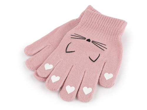 Dětské pletené rukavice jsou na horní straně ozdobené gumovým potiskem kočky a srdíčky. Jsou vyrobené z pružné, hřejivé pleteniny, která se ruce skvěle přizpůsobí. Díky pružnému lemu kolem zápěstí pevně drží - nesklouzávají. Jsou ideálním doplňkem do sychravého podzimního a zimního počasí. Šířka je měřená na volně položených rukavicích uprostřed (bez palce). Rukavičky mají univerzální velikost (jsou natahovací), doporučujeme je pro děti cca 5 - 10 let.