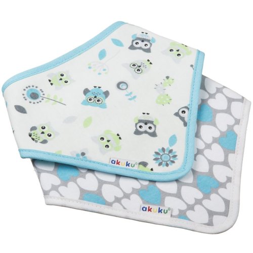 Praktický dětský bryndáček-šátek Akuku. Bryndáček s jednou vrstvou z jemné froté bavlny a druhou vrstvou hladké bavlny, chrání jak citlivou dětskou pleť, tak i oblečení před ušpiněním. Bryndáček je vhodný pro malé děti, kterým rostou zoubky a nadměrně slintají, a také slouží jako módní doplněk k oblečení. Praktické zapínání na suchý zip. Složení: 100 % bavlna. Rozměry: 38 cm (obvod kolem krku) x 16 cm (délka od krku). Sada obsahuje 2 šátky.