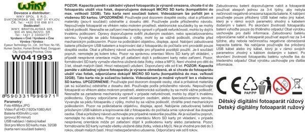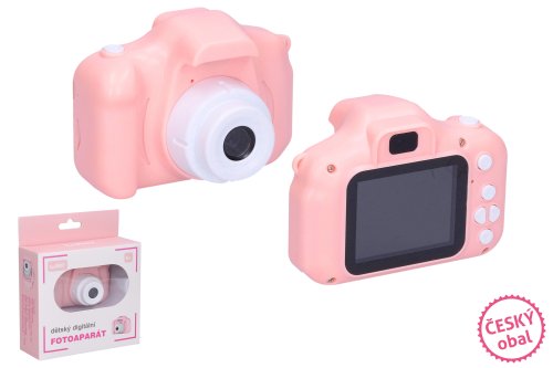 Dětský digitální fotoaparát růžový - foto 48Mpx, video Full HD. Rozměry 8,3x5x6 cm. Rozlišení fotografií 48 megapixelů, videa Full HD (1920x1080). Selfie kamera, časovač, vložení času, digitální zoom, různé efekty (rámečky, vložené animace, deformace, filtry) fotografií, hry, mp3 přehrávač, 2,0 palcový displej. Vestavěná 400mAh Li-ion baterie, USB kabel a popruh součástí. Formát fotografií jpg, videa avi. Provoz 80-150 min. Kompatibilní s micro SD kartami - max. 32GB. Paměťová karta není součástí.
