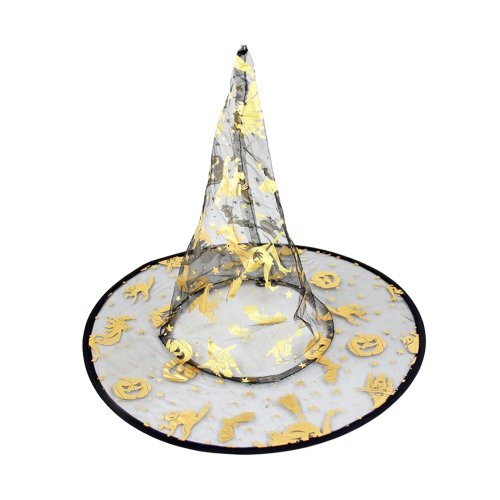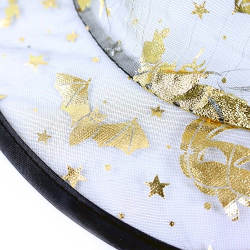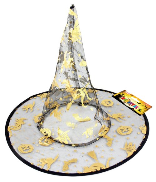 Čarodějnický klobouk s magickými motivy je skvělým doplňkem na Halloween párty nebo karneval! Klobouk je vyroben z černé síťky a je zdoben zlatými obrázky. Staň se hvězdou večírku díky tomuto klobouku!