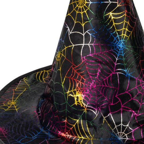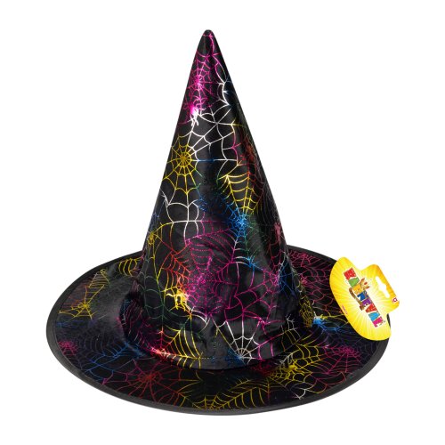 Veselý halloweenský klobouk je skvělým doplňkem na besídku nebo karneval! Klobouk černé barvy je zdoben barevnou pavučinkou.
