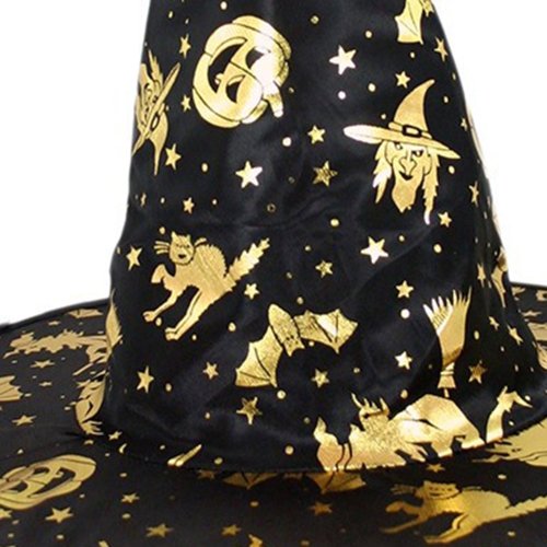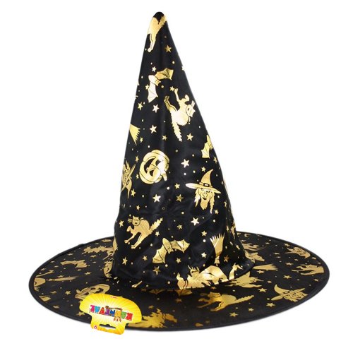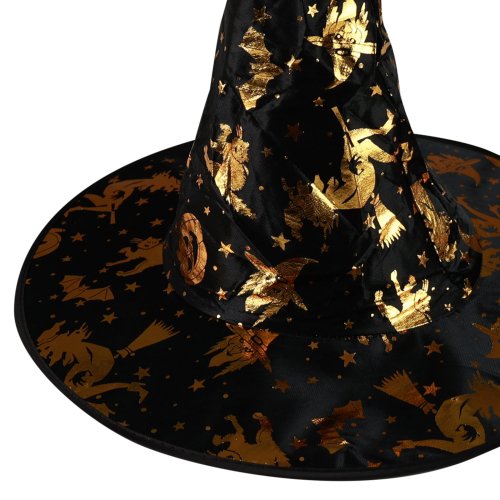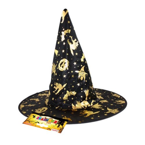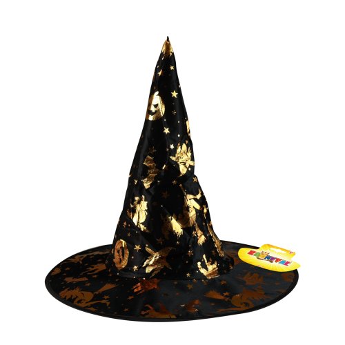Veselý halloweenský klobouk je skvělým doplňkem na besídku nebo karneval! Klobouk černé barvy je zdoben zlatými magickými motivy. Staň se halloweenskou hvězdou díky tomuto klobouku! Průměr klobouku činí 20 cm.