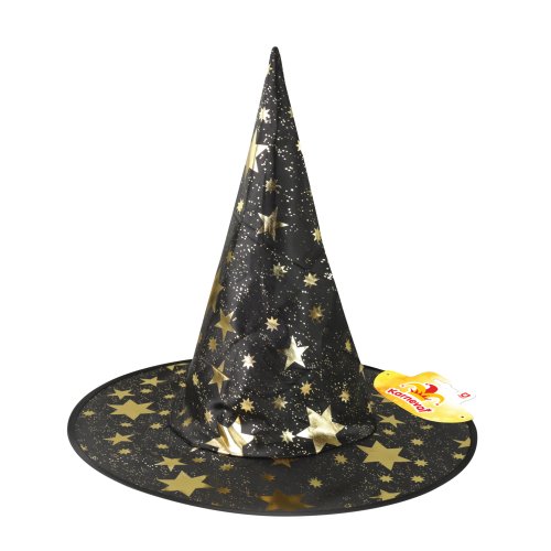 Úžasný čarodějnický klobouk v černé barvě s potiskem zlatých hvězdiček. Ideální i na halloweenský večírek nebo karneval!