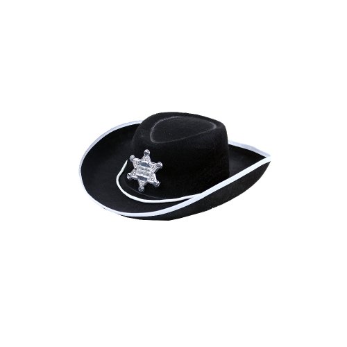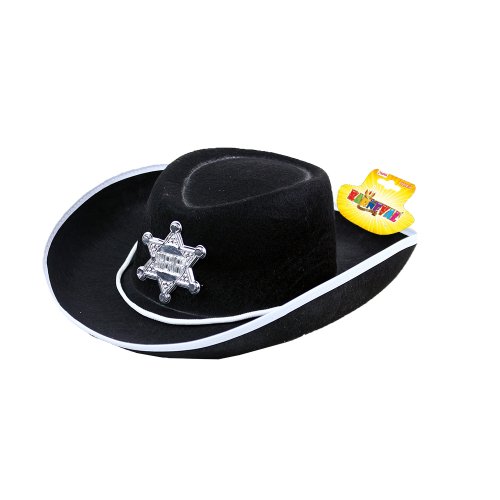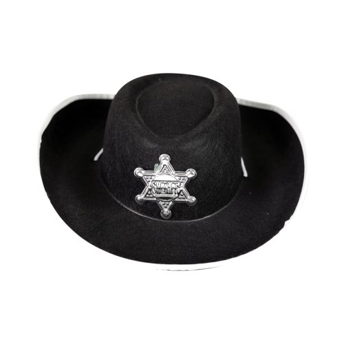 Senzační klobouk pro malé šerify! Tento černý elegán je zdoben opravdickým odznakem s nápisem SHERIFF a stříbrným lemováním. Staň se hvězdou karnevalového večírku díky tomuto nepřehlédnutelnému klobouku a ohrom tak všechny své kamarády!