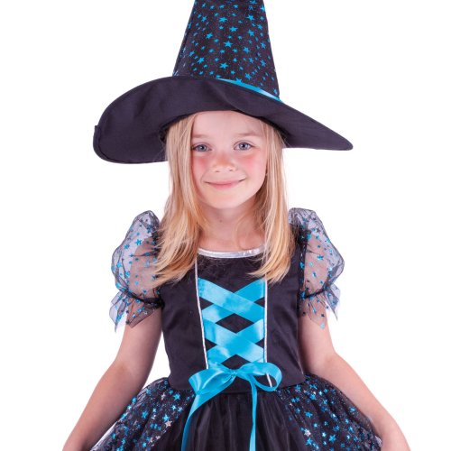 Parádní karnevalový kostým s motivem čarodějnice! Kostým modro-černé barvy ve velikosti S je určen pro holčičky ve věkovém rozmezí 4-6 let (105-116 cm). Šaty jsou zdobené tyrkysově modrou stuhou a metalickými hvězdičkami. Součástí balení je perfektně sladěný klobouk, který je rovněž zdoben modrými hvězdičkami a stuhou. Staň se hvězdou karnevalového nebo Halloweenského večírku!
