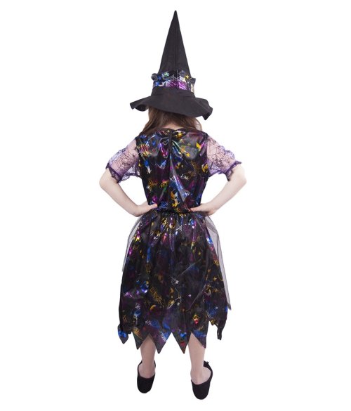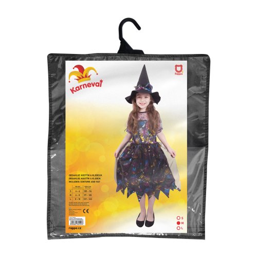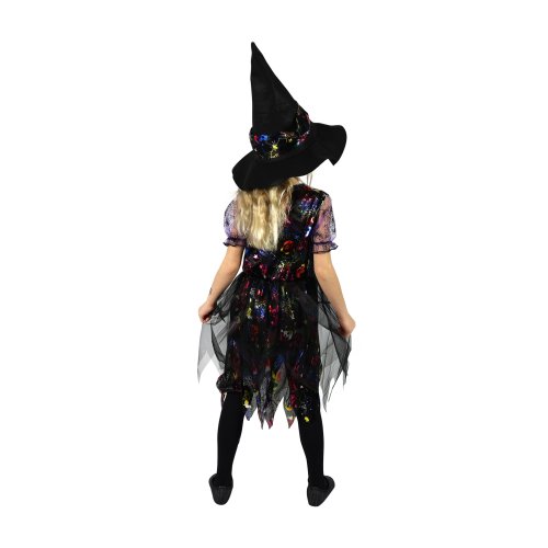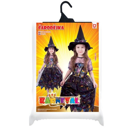 Karnevalový kostým pro malé čarodějnice! Kostým černo-fialové barvy ve velikosti M je určen pro holčičky ve věkovém rozmezí 6-8 let (117-128 cm). Šaty jsou dekorovány barevnými halloweenskými motivy. Součástí kostýmu je perfektně sladěný čarodějnický klobouk. S tímto úchvatným kostýmem se zaručeně staneš hvězdou karnevalu i Halloweenu! Koště není součástí.