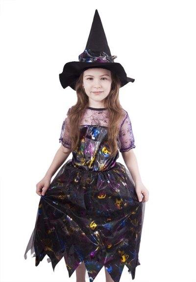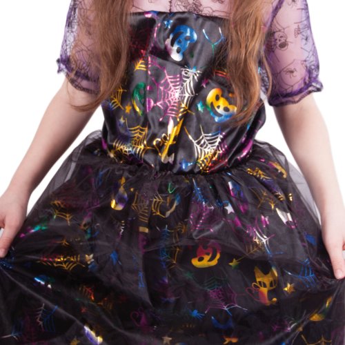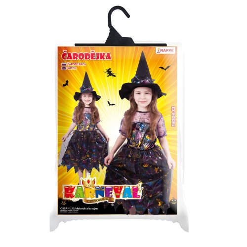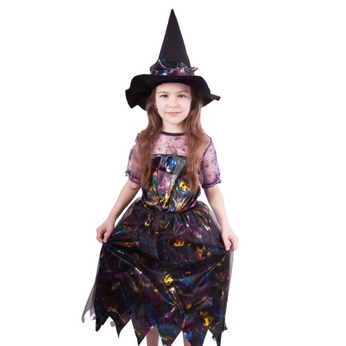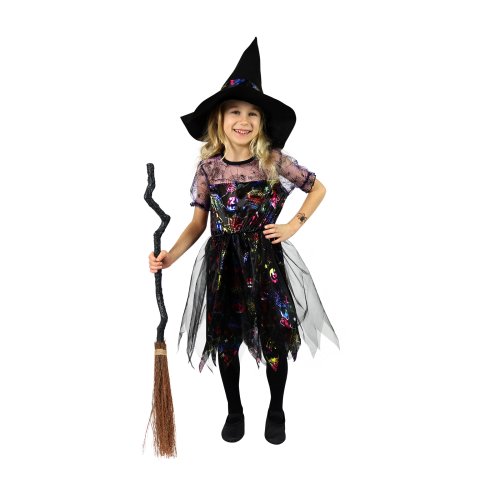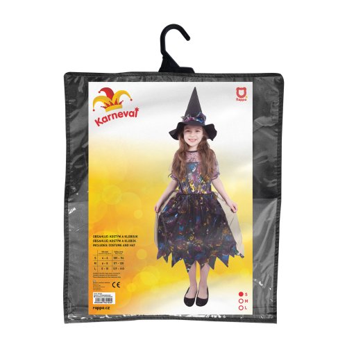Karnevalový kostým pro malé čarodějnice! Kostým černo-fialové barvy ve velikosti S je určen pro holčičky ve věkovém rozmezí 4-6 let (105-116 cm). Šaty jsou dekorovány barevnými halloweenskými motivy. Součástí kostýmu je perfektně sladěný čarodějnický klobouk. S tímto úchvatným kostýmem se zaručeně staneš hvězdou karnevalu i Halloweenu! Koště není součástí.