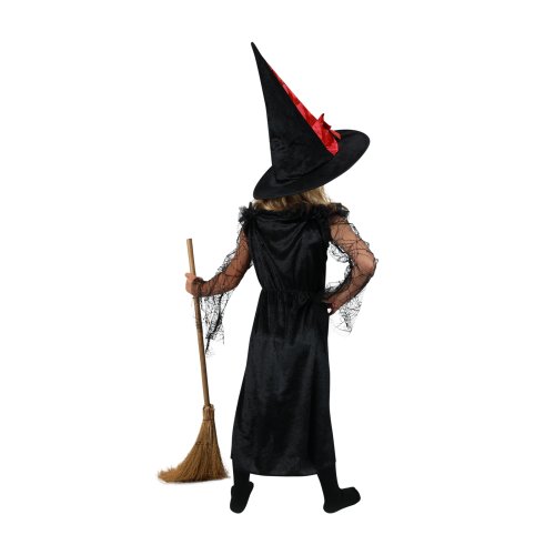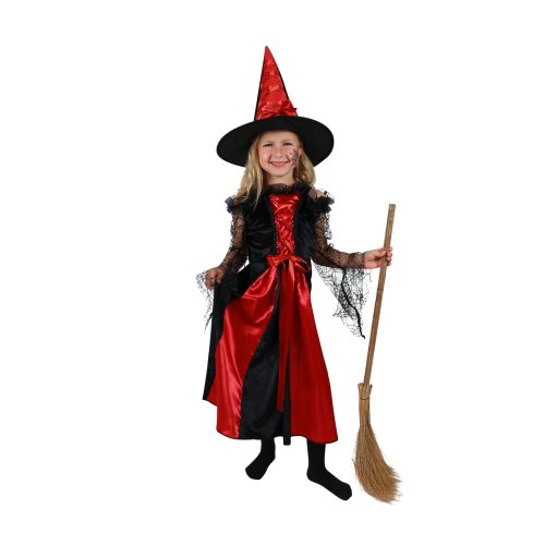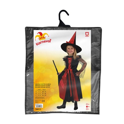 Roztomilý karnevalový kostým černo-červené barvy udělá radost každé holčičce! Souprava obsahuje šaty s pavučinkovými rukávy a klobouk s mašlí. Set ve velikosti M je určen pro holčičky ve věkovém rozmezí 6-8 let (117-128 cm). Vhodný i na oslavu Halloweenu! Koště ani hůlka nejsou součástí balení.