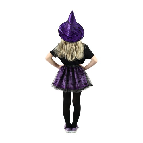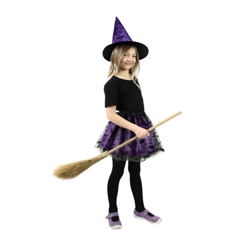 Magický kostýmek pro malé čarodějnice ve fialové barvě, zdobený černým potiskem netopýrů. Kostým je určen pro holčičky ve věkovém rozmezí 3-7 let. Balení obsahuje nadýchanou sukničku a k tomu perfektně sladěný klobouk. Délka sukýnky je cca 30 cm. Sukně je v pase na gumičku. Vhodný i na oslavu Halloweenu.