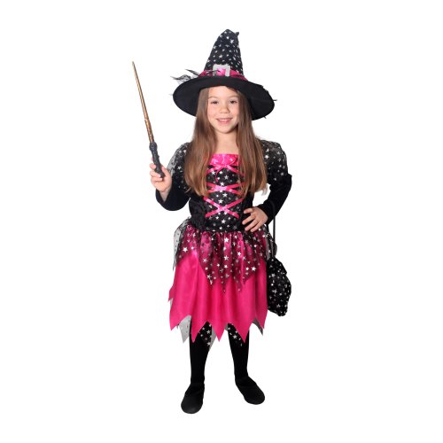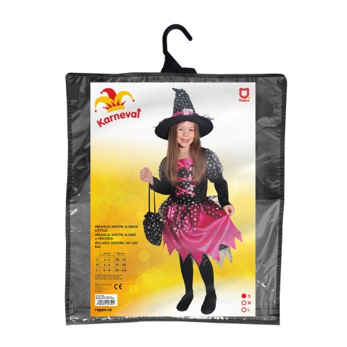 Magický karnevalový kostým pro malé čarodějnice! Kostým černo-růžové barvy ve velikosti S je určen pro holčičky ve věkovém rozmezí 4-6 let (105-116 cm). Šaty jsou dekorovány růžovými stuhami a stříbrnými hvězdičkami. Součástí kostýmu je perfektně sladěný čarodějnický klobouk a taštička. S tímto úchvatným kostýmem se zaručeně staneš hvězdou karnevalu i Halloweenu!