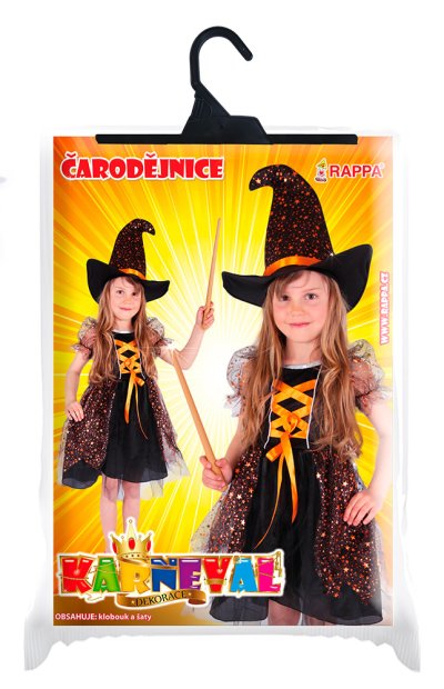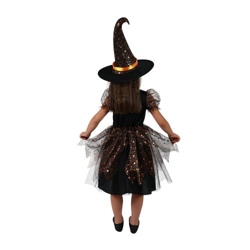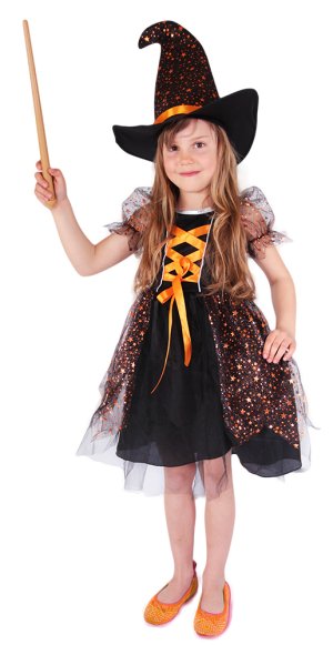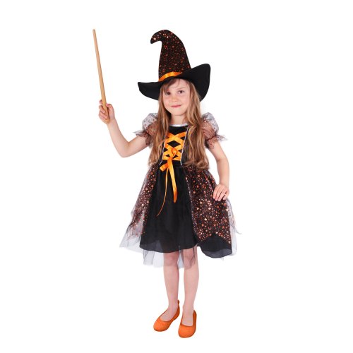 Magický karnevalový kostým pro malé čarodějnice! Kostým černé barvy ve velikosti L je určen pro holčičky ve věkovém rozmezí 8-10 let (128-140 cm). Šaty jsou dekorovány oranžovými stuhami a metalickými hvězdičkami. Součástí kostýmu je perfektně sladěný čarodějnický klobouk. S tímto úchvatným kostýmem se zaručeně staneš hvězdou karnevalu i Halloweenu!