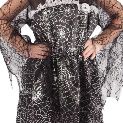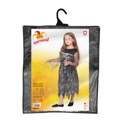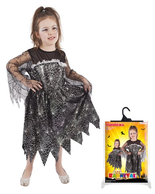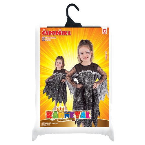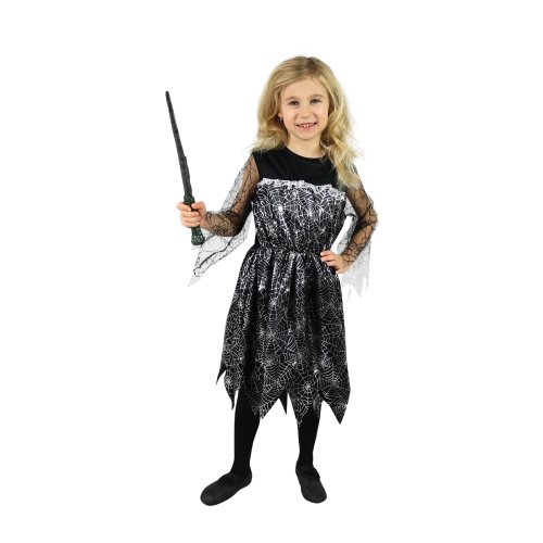 Magický karnevalový kostým pro malé čarodějnice! Kostým ve velikosti S je určen pro holčičky ve věkovém rozmezí 4-6 let (105-116 cm). Černé šaty jsou dekorovány stříbrnou pavučinkou. S tímto úchvatným kostýmem se zaručeně staneš hvězdou karnevalu i Halloweenu! Koště ani hůlka nejsou součástí balení.