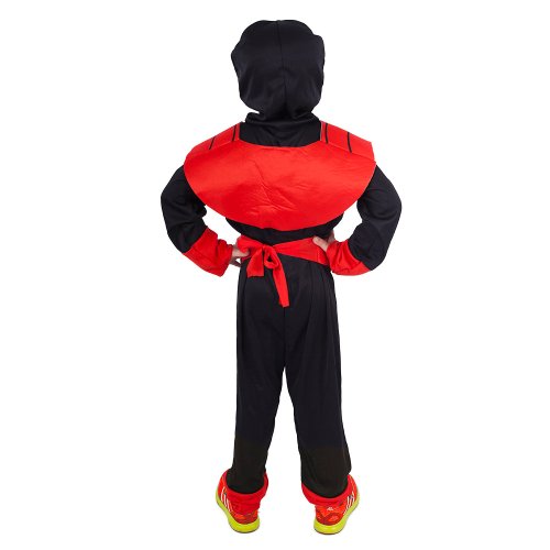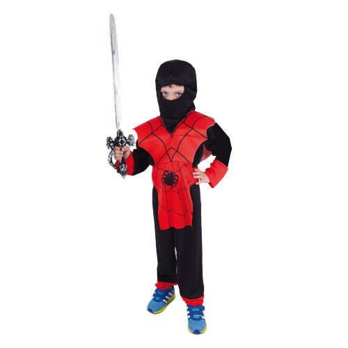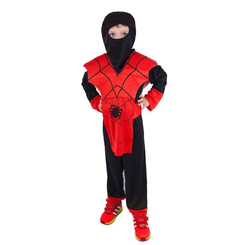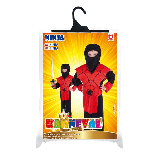 Karnevalový kostým NINJA ve velikosti S je určen pro chlapce ve věkovém rozmezí 4-6 let (105-116 cm). Balení obsahuje overal, vestu, kuklu, čelenku a opasek. Červené prvky kostýmu jsou dekorovány pavoukem a pavučinami. Meč není součástí balení.