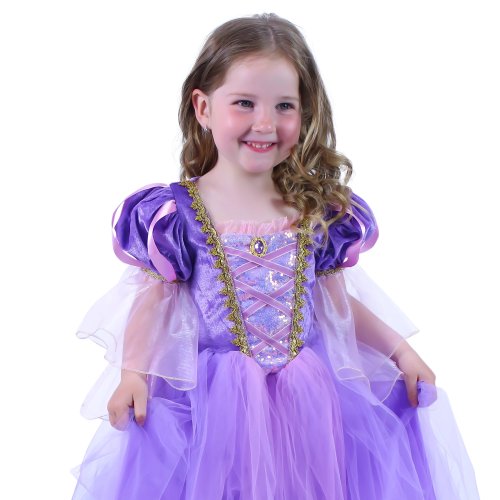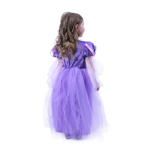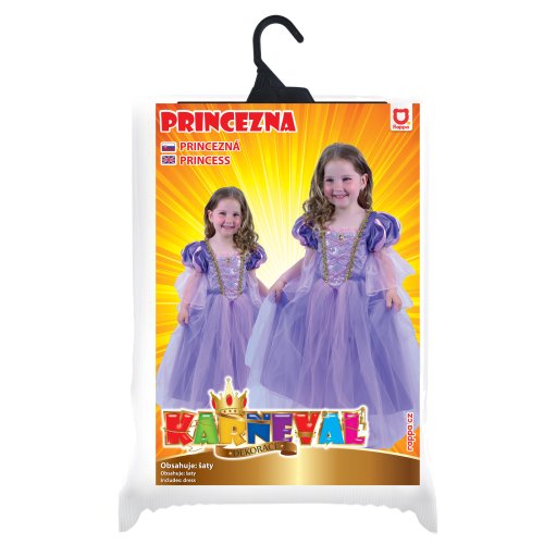 Úchvatný dívčí kostým pro princezny! Kostým princezny ve velikosti M je určen pro holčičky ve věkovém rozmezí 6-8 let (117-128 cm). Kostýmek je ušit v růžovo-fialkové barvě a zdoben zlatým lemováním.