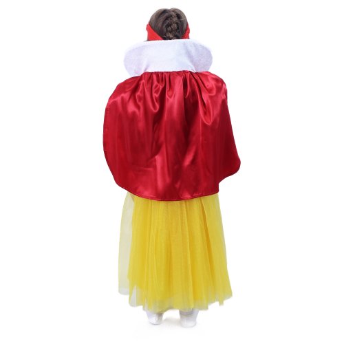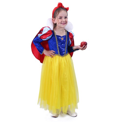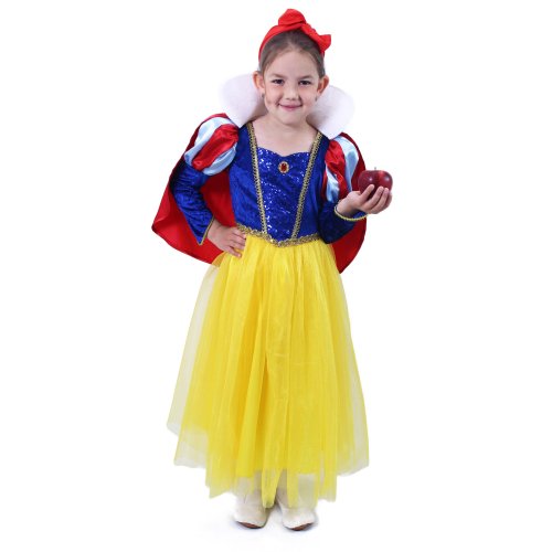 Proměň se během chvilky v půvabnou Sněhurku! Kostýmek o velikosti M je určen pro holčičky ve věkovém rozmezí 6-8 let (117-128 cm). Barevný kostým je dekorován v přední části modrými flitry a zlatým zdobením. Součástí je odnímatelný červený plášť s bílým límcem. Neobsahuje mašli do vlasů.