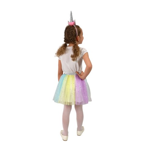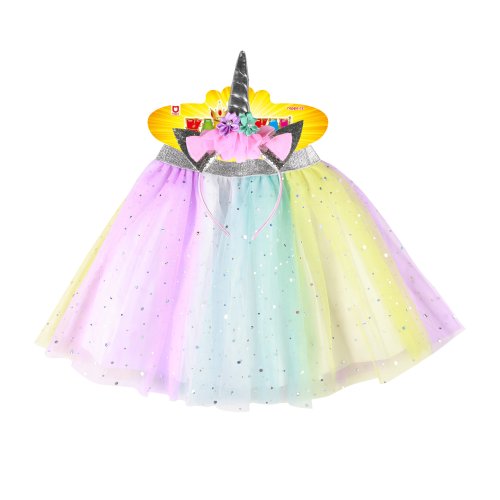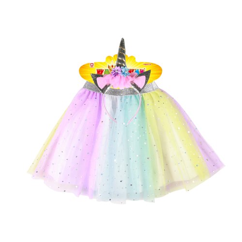 Úchvatná sukýnka TUTU je určena pro holčičky ve věkovém rozmezí 3-7 let. Nadýchaná sukně v duhových barvách je dolněna sříbrnou gumou v pase. Součástí této sady je senzační čelenka jednorožce se sříbrným rohem a barevnými růžemi! Délka sukýnky je cca 30 cm.