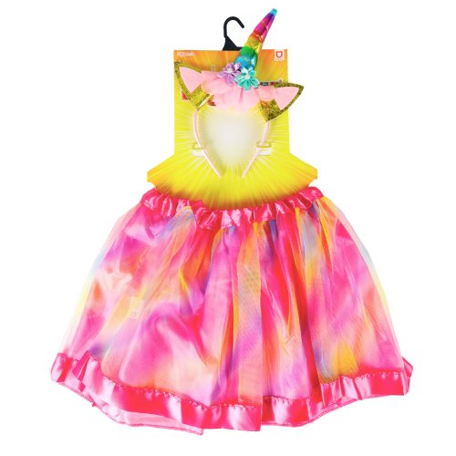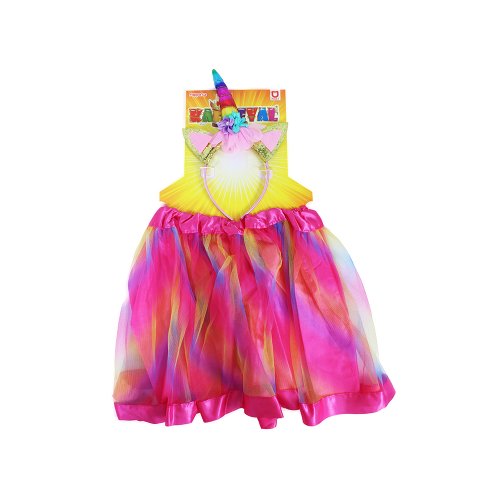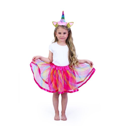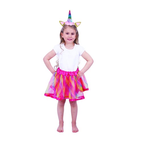 Roztomilá sukýnka TUTU je určena pro holčičky ve věkovém rozmezí 3-7 let (104-146 cm), obvod pasu 48-80 cm. Tento úchvatný kousek v duhových barvách je zdoben saténovým lemováním. Součástí této sady je senzační čelenka jednorožce se zlatým rohem a barevnými růžemi!
