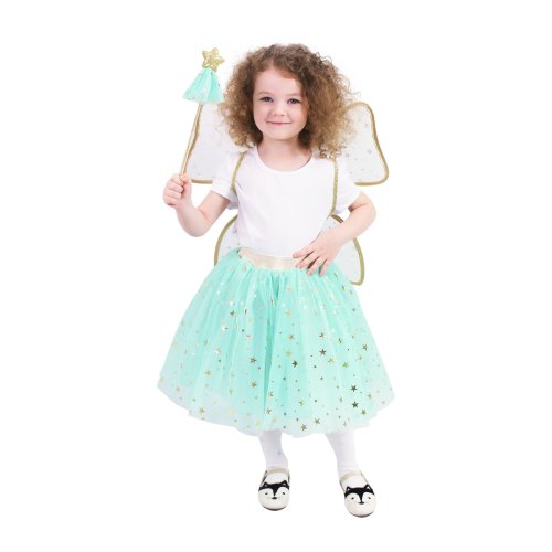 Krásná vílí sada pro malé holčičky! Sada obsahuje zelenou tylovou TUTU sukýnku s potiskem zlatých hvězdiček a zlatou gumou v pase, k tomu perfektně sladěná křídla a hůlku ve stejném motivu. Sukně je dlouhá cca 35 cm a je vhodná pro obvod pasu 50-60 cm. Určeno pro holčičky ve věkovém rozmezí 3-10 let (104-146 cm).