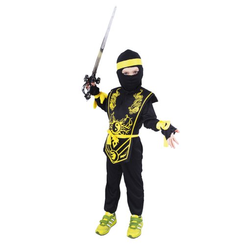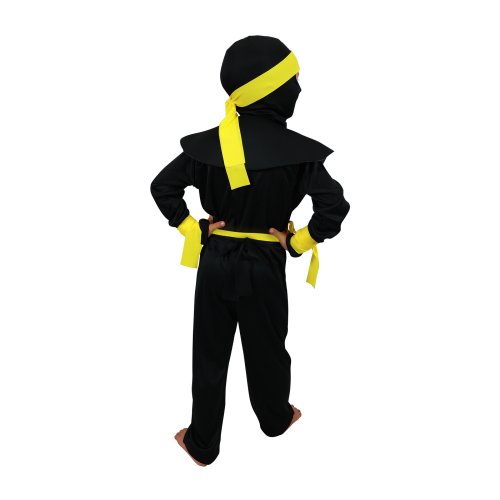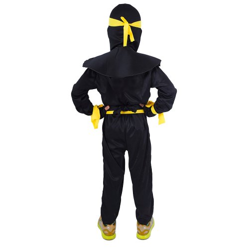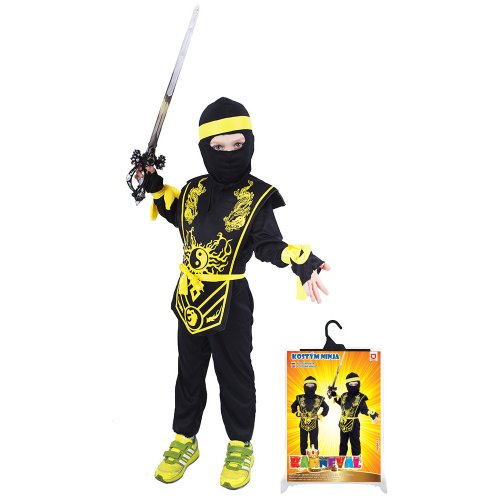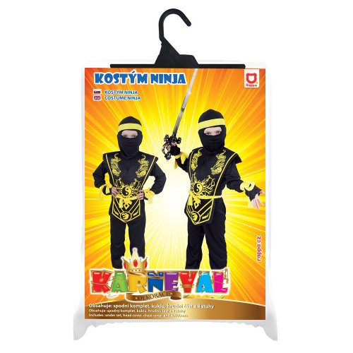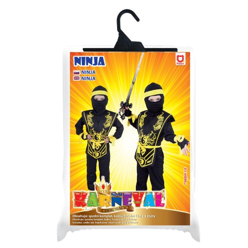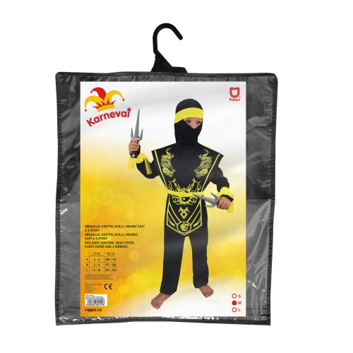 Karnevalový kostým ninja ve velikosti M je určen pro chlapce ve věkovém rozmezí 6-8 let (116-128 cm). Balení obsahuje overal, vestu zdobenou žlutými bojovnými motivy, kuklu, čelenku, opasek a pásky na ruku.
