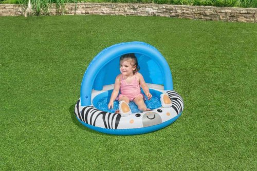 Dětský nafukovací bazén se stříškou Bestway. Krásně barevný bazének s africkými motivy určitě potěší Vaše dětičky během letních dnů. Dopřejte svým dětem pohádkové lenošení na vodě. Součástí bazénu je nafukovací stříška, která chrání děti před paprsky sluníčka. Vhodný pro deti od 2 let. Rozměr: cca 97x66 cm. Obsah: 26l. Složení vinyl.
