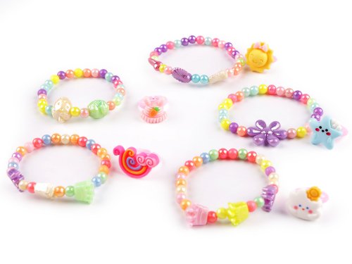 Dětská sada roztomilých šperků z plastových korálků s perlovým leskem obsahuje náramek a prstýnek. Lesklé korálky na náramku jsou navlečené na pružné gumičce. Náramek je ozdobený většími korálky s různým motivem. Ozdoba na prstýnku je 3D, zadní strana prstýnku je otevřená, má univerzální velikost určenou pro drobné dětské prsty. Náramek nemá uzávěr, je pružný, jde pohodlně navléci.
