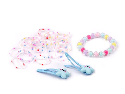 Sada dětského náramku, pukaček a gumiček do vlasů je ideální pro holčičky, které se rády parádí. Vše je uschováno v otevíracím plastovém boxu ve tvaru pojízdného kufru. Sada obsahuje pružný náramek z plastových korálků, 2 pukačky s ozdobami a 40 gumiček. Box je transparentní, má pojízdná kolečka a vysouvací madlo jako opravdový kufr.