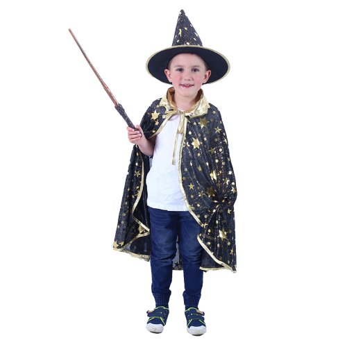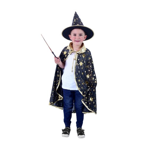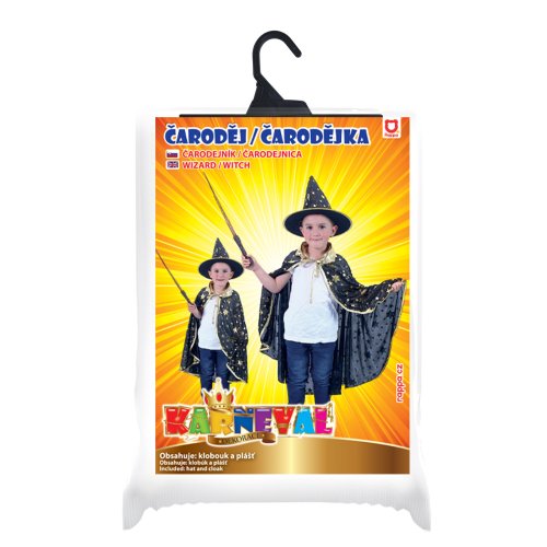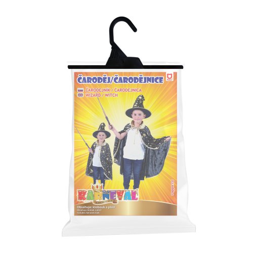 Perfektní souprava pro všechny čarodějnice nebo čaroděje na párty, karneval nebo oslavu Halloweenu! Balení obsahuje čarodějnický plášť černé barvy se zlatým lemováním a hvězdami a perfektně sladěný klobouk. V těchto exkluzivních doplňcích tě zaručeně nikdo nepřehlédne! Určeno pro děti od 3-7 let. Délka 72 cm. Hůlka není součástí balení.