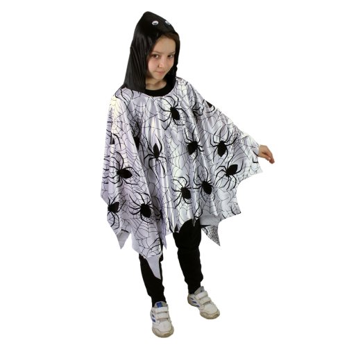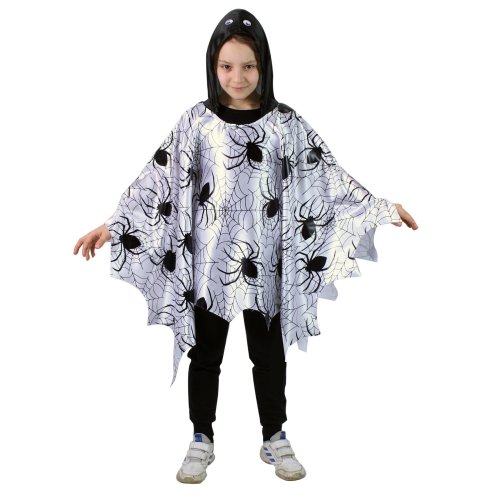 Dětský plášt s kapucí je určen pro všechny holky a kluky ve věkovém rozmezí 3-10 let (104-150 cm). Plášť bílé barvy s černým potiskem pavouků a pavučin je doplněn černou kapucí s očima. Ideální doplněk na Halloween párty či slavnosti čarodějnic. Délka pláště cca 65 cm.