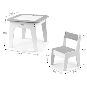 Židličky jsou lehké, takže je děti mohou snadno přenášet, a jejich stabilní konstrukce spolu s oblejšími rohy zaručuje bezpečné používání. Nábytek je vyroben z kvalitní MDF desky, díky čemuž je odolný, snadno se čistí a jednoduše se skládá. Balení obsahuje všechny potřebné prvky pro rychlou a snadnou montáž.
