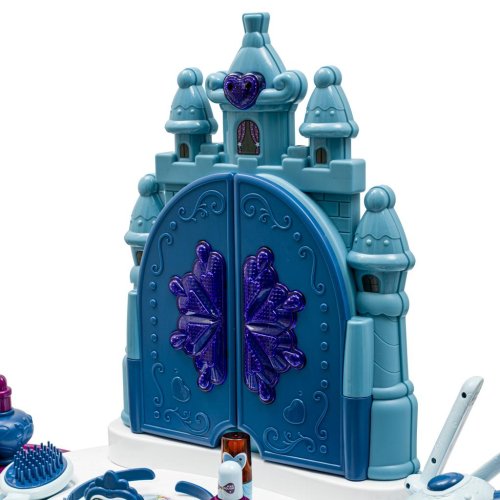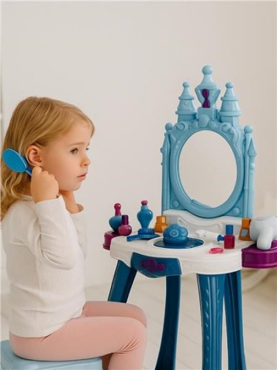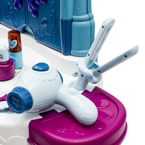 Dětský toaletní stoleček s taburetem obsahuje sadu maket kosmetiky, jako je fén, hřeben, laky na nehty, prsteny, květiny do vlasů, náramky, náhrdelník a nálepky. Součástí sady je také umělá hůlka, po stisknutí hůlky se otevře zrcadlo. Toaletní stoleček je vybaven zásuvkou pro uchovávání drobností. Sada vyžaduje 5AA baterií, které nejsou součástí balení.