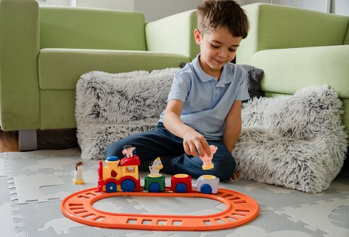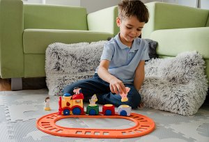 Vlaková dráha s velkou mašinkou na baterie. Vlak vydává zvuky.
