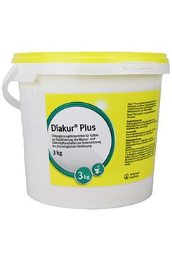 Diakur Plus odstraňuje příčiny průjmu nacházejících se ve střevech a poskytuje teleti obranu proti opětovným problémům. Diakur Plus Dietní doplňkové krmivo určené pro fyziologické zažívání u telat pro stabilizaci vodní a elektrolytové rovnováhy. Diakur Plus podporuje rychlou absorpci elektrolytů a vody. Obsahuje unikátní 3fázový pufrovací systém, který umožňuje krmení s mlékem, mléčnou náhražkou nebo s vodou. Diakur Plus obsahuje 21 % patentované hydrofobní citrusové vlákniny. Složení: Glukóza, sušená citrusová dužina, chlorid sodný, hydrogenuhličitan sodný, octan sodný, citronan sodný, inaktivované kvasinky, chlorid draselný. Aditiv: sojový lecitin 6%, glycin 2500 ppm, antioxidant (ethoxyquin E 324) 60 ppm. Analytické složky: Glukóza 56,0%, hrubý protein 3,2%,hrubé oleje a tuky 4,5%, hrubý popel 13,8%, hrubá vláknina 2,6%, sodík 4,5%, draslík 1,5%, chlorid 3,6%, bikarbonát 2,9%, citrát 1,9%. Dávkování: Diakur Plus by měl být používán u telat po dobu 1–7 dnů v případě rizika zažívacích potíží (průjem), v jejich průběhu nebo při rekonvalescenci. U telete s hmotností 50 kg smíchejte 100 g produktu Diakur Plus (jeden sáček) s 2 litry vody o teplotě 35–40 °C a ihned zkrmte. Opakujte 2–3krát denně. U větších telat použijte 150 g produktu Diakur Plus (1½ sáčku) smíchaného s 3 litry vody. V případech nekomplikovaného průjmu může být Diakur Plus smíchán s mlékem nebo náhražkou mléka, namísto vody. V takových případech se doporučuje nabídnout teleti další vodu mezi krmením mlékem. Před použitím a v případě prodloužené doby užívání se doporučuje vyžádat si stanovisko veterinárního lékaře.