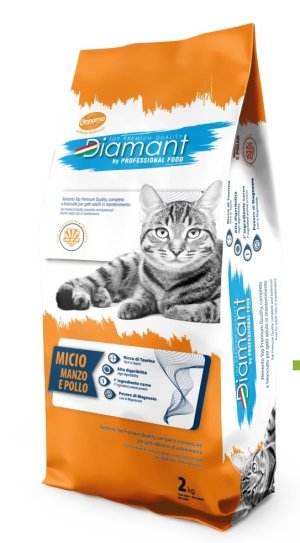 Speciální receptura krmiva Diamant micio manzo e pollo zajišťuje vysoce stravitelné bílkoviny, díky nimž je denní dávka vyvážená a snadno vstřebatelná.