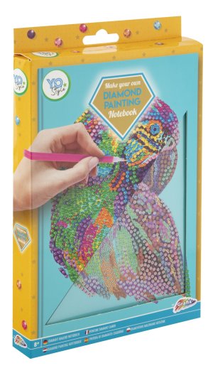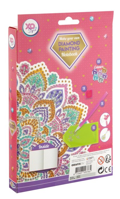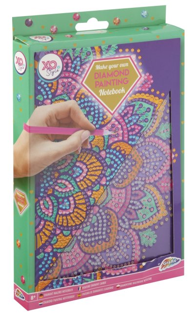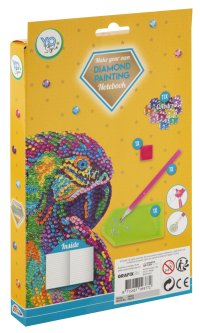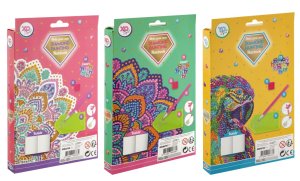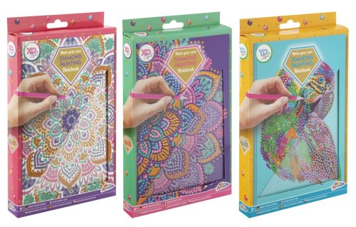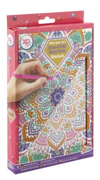 Malování pomocí kamínků Diamond – diář A5 – pomocí kamínků si vytvoř svůj vlastní design diáře – tři různé druhy – dva různé typy mandal a papoušek. Balení obsahuje diář A5, třídič na kamínky, aplikátor, 11 barev kamínků a lepidlo.