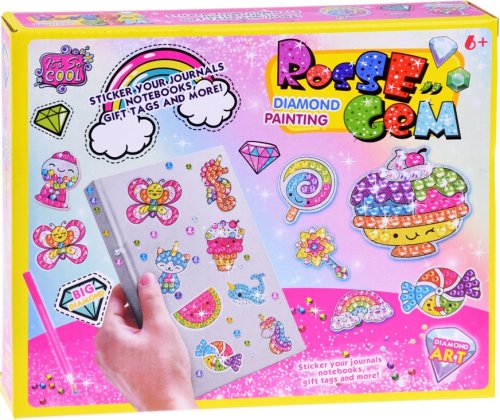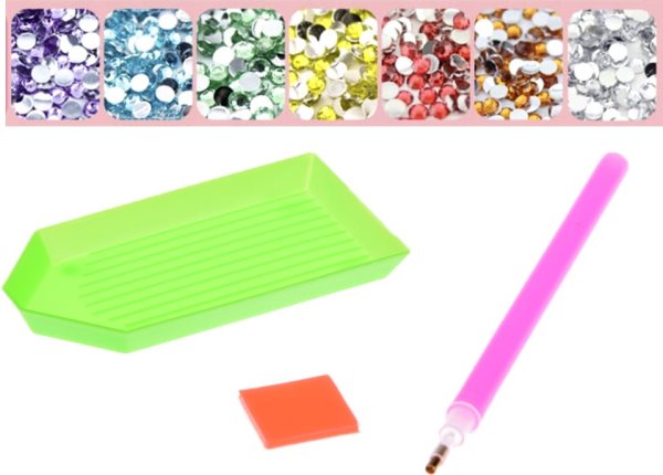 Balení obsahuje: barevné kamínky, aplikátor, misku, vosk a 12 ks samolepek. Diamantové malování - postup: Horní strana samolepek je potažena lepidlem a překrytá průhlednou folií. Kamínky požadované barvy vysypejte do misky. Do hrotu pera naberte vosk, díky kterému se kamínky snadno přichytí na pero, a nanášejte na obrázek.