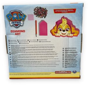 Kreativní sada diamantové malování. Pomocí nalepování malých kamínků/diamantů na předlohu si vytvoř nádherný obrázek pejska Skye z pohádky Tlapková patrola o velikosti 18x18 cm, sada obsahuje obrázek/předlohu, kamínky/diamanty, pero k aplikaci kamínků na předlohu, tácek, lepící čtvereček a návod