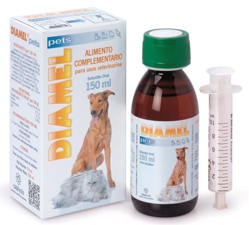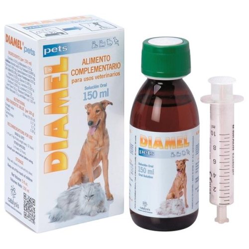 Dietní doplňkové krmivo pro veterinární použití. Efektivní podpora a kontrola regulace hladiny glukózy v krvi jako předcházení diabetu. Stimuluje metabolismus pankreatu. Tato stimulace je podpořena přírodními složkami - extrakty ze zeleného čaje a borůvek, které podporují biosyntézu inzulínu. Příznivě ovlivňuje tlak krve. Zpomaluje rozvoj cévních komplikací. Výsledky použití této speciální diety s antioxidanty proti oxidativnímu stresu provázejícímu diabetes, byly podpořeny klinickými studiemi. Tyto studie potvrzují, že DIAMEL pets, preparát přírodního složení, je efektivní pro regulaci biosyntézy inzulínu a snížení inzulínové rezistence, má výrazný efekt i na regulaci tlaku krve. Napomáhá snížení hladiny glukózy, cholesterolu, kyseliny močové a triglyceridů do osmi týdnů. DIAMEL Pets obsahuje aminokyseliny, vitaminy a stopové prvky v unikátní kombinaci s cílem normalizovat hladinu glukózy, cholesterolu a urátů v krvi. Navíc obsahuje antioxidanty, které chrání buňky před poškozením. Tři složky – kyseliny listová, vitamin B12 a vitamin B6 brání vzniku homocysteinu, redukují jeho koncentraci v krvi a tím snižují riziko kardiovaskulárních a degenerativních chorob jako např. diabetická retinopatie. Diabetes melitus typu II zapříčiňuje vznik cévních poruch spojených se zvýšenou hladinou homocysteinu a to je rizikový faktor pro následné další cévní komplikace a diabetické retinopatie. Složení: 150 ml přípravku obsahuje: extrakt z brusinek 0,015 g, maltodextrinum 0,15 g. Pomocné látky: kyselina askorbová 0,3 g, vitamin B6 0,00495 g, kyselina listová 0,495 mg, vitamin B12 0,0024 mg, síran zinečnatý (E6) 0,09 g, kalcium pantothenát 0,015 g, arginin 0,5325 g, glycin 0,1065 g, kyselina fumarová 0,5325 g, L-carnitine 0,5325 g, ornitine 0,2655 g, L-cysteine 0,213 g, játrová příchuť 0,6 g, kalium sorbát 0,3 g, natrium benzoát 0,3 g, čištěná voda do 150 ml. Nutriční a energetická hodnota ve 100 g: Energetická hodnota 19 kcal (79,55 kJ) Proteiny 3,17 g Uhlohydráty 0,7 g Tuky 0,38 g Doporučené dávkování: Psi a kočky: 1 ml na 5 kg živé hmotnosti každých 12 hodin. Ostatní malá zvířata: 1 ml každých 12 hodin. Před použitím nebo před prodloužením doby používání se doporučuje vyžádat si stanovisko veterinárního lékaře.