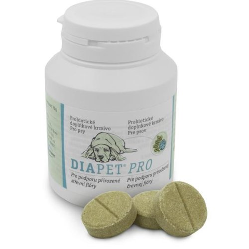 Složení: Čekankový inulin, pivovarské kvasnice, maso a výrobky živočišného původu, mléko a mléčné výrobky, dextróza, lososový olej (5 %), vitamín B12 10 mg/kg, L-Glutamin (3c451) 63.500 mg/kg, Enterococcus lactis NCIMB 10415 (4b1705ii) 400 x 109 CFU, heřmánkový extrakt 2.500 mg/kg Dávkování: Podávejte samostatně nebo s jídlem. Pes do 10kg – ½ tablety denně Pes nad 10 kg – ½ tablety denně na 10 kg hmotnosti Délka podávání: 1-2 týdny. Pokud se podává současně s antibiotickou léčbou, podávejte DiaPet® Pro po dobu až 7 dní po ukončení léčby. Nepoužívejte současně s makrolidy. Skladování: 15°-25°C Balení: Čistá hmotnost 70 g / 14 žvýkacích tablet po 5 g Velikost balení: 6 x 8,5 x 6 cm