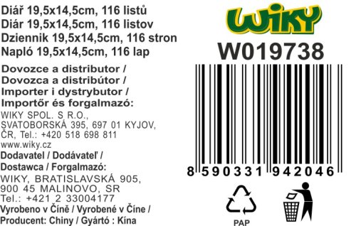 Diář v dálkovém balení. 116 různých (linkovaných, čtverečkovaných atd.) stran. 4 různé barevné provedení. Velikost dárkového balení - 17x4x22 cm. Velikost diáře - 14,5x19,5 cm.