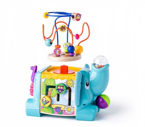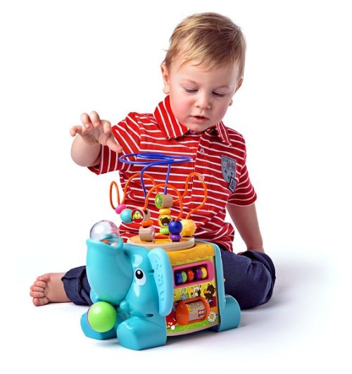 Didaktický slon nabízí dětem nespočet herních variant. Barevné provedení zaujme každého malého objevitele. Zatáhněte za míč v pusince slona, pusťte a sledujte korálky v chobotu. Kličkou na zadečku rozpohybujete ozubená barevná kolečka. Na boku slona naleznete malé bludiště se sovičkou a ptáčkem. Na druhém boku je umístěno počítadlo s barevnými korálky a váleček s notami. Na zádech nosí slon nádherný labyrint, který lze odejmout a děti si s ním mohou hrát samostatně. S touto hračkou děti procvičují nejen jemnou motoriku, trpělivost, přesnost, barvy, ale i soutěživost. Rozměr: 27 x 18,5 x 29 cm. Věk: 6m+.