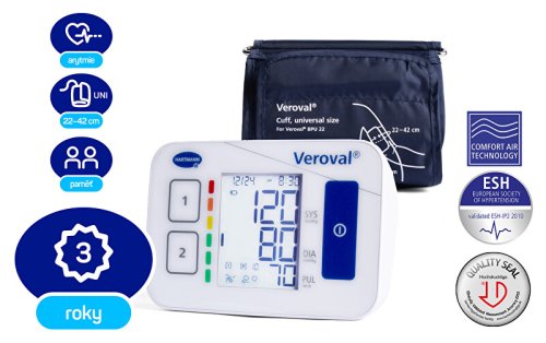 Cenově dostupný tlakoměr umí navíc detekovat arytmie a uloží měření až pro 2 uživatele. Plně automatický pažní tlakoměr Veroval® COMPACT má sympatickou cenovku a je ideálním pomocníkem pro pravidelné měření krevního tlaku v domácím prostředí nebo na cestách (v balení najdete látkový obal pro přepravu). Vedle odhalení vysokého nebo nízkého tlaku vás upozorní i na poruchy srdečního rytmu. Díky svému kompaktnímu designu je rychle připravený k použití a jeho ovládání zvládne díky přehlednému displeji, velkým tlačítkům a jasným ikonám opravdu každý. Výsledek pak snadno vyhodnotíte podle barev. Starejte se o své zdraví s tímto spolehlivým pomocníkem s prodlouženou 3letou zárukou.