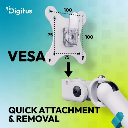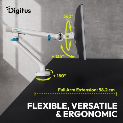 Plně mobilní držák pro jeden monitor je ideálním řešením pro moderní pracovní stanice, kde je flexibilita, ergonomie a organizace prvořadá. Tento držák je určen pro obrazovky do 35 palců a s nosností až 10 kg, takže je vhodný jak pro ploché, tak pro zakřivené monitory. Díky integrovanému pružinovému napínacímu mechanismu lze monitor plynule nastavit na příslušnou hmotnost bez použití nářadí – pro dokonalou rovnováhu a snadné nastavení v jakékoli poloze. Držák nabízí maximální mobilitu: otáčení, naklápění, otáčení a nastavení výšky umožňují ergonomické nastavení monitoru podle individuálních požadavků. Praktická funkce rychloupínání VESA umožňuje rychlé a snadné připevnění nebo odebrání obrazovky, zatímco rychloupínací spojka usnadňuje instalaci držáku. Díky svému prostorově úspornému designu a integrovanému systému správy kabelů držák monitoru nejen zajišťuje úhledný vzhled, ale také maximalizuje využitelnou pracovní plochu. Dvě možnosti montáže – stolní svorka nebo průchodka – nabízejí dodatečnou flexibilitu montáže. Držák je kompatibilní se standardy VESA 75x75 a 100x100, a proto je všestranný.
